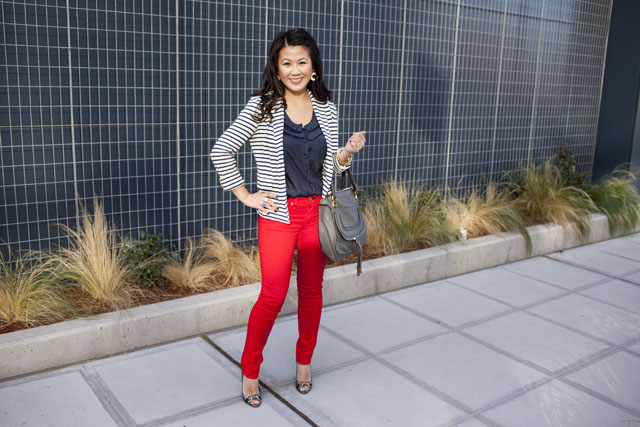 I love the striped blazer with the bright red jeans look!! So cute. 🙂