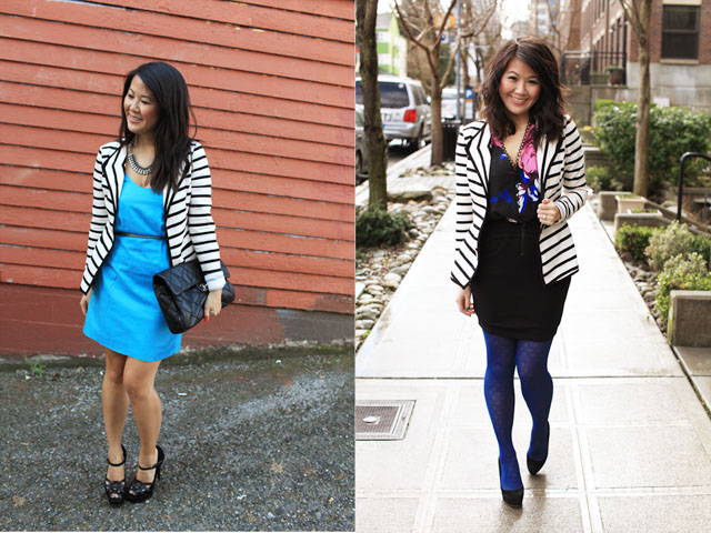 I love blazers and probably have way too many in my closet but during fall and winter, I wear them all the time so I definitely get my use out of all of mine!  I’ve been gravitating towards printed blazers lately and with yesterday’s post with the floral blazer, it got me thinking about my favorite striped blazers and how I need to re-work them into my wardrobe as I kind of forgot about them.