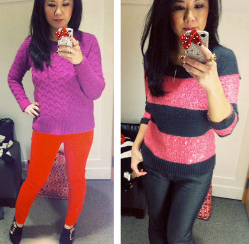 November 23, 2011 at 9:08 pmTiff, I love everything you tried on! The flats and the sequin striped sweater is definitely my faves! Me loves shiny. tee hee.