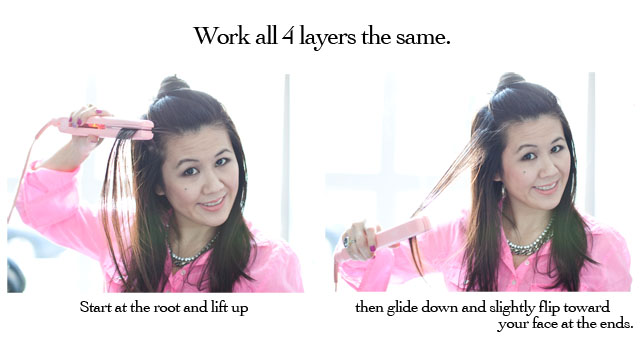 Make sure to spray your hair with the heat protectant spray before you start.  (I skipped showing you the bottom 2 layers as it was easier to photograph the top 2.  The technique is the same)