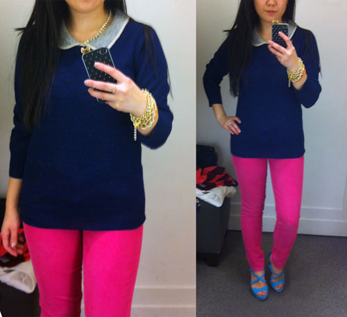 September 13, 2012 at 3:46 pmthanks for the great finds!! loving the peter pan collared sweater and these hot pink pants! def something id wear to class =)