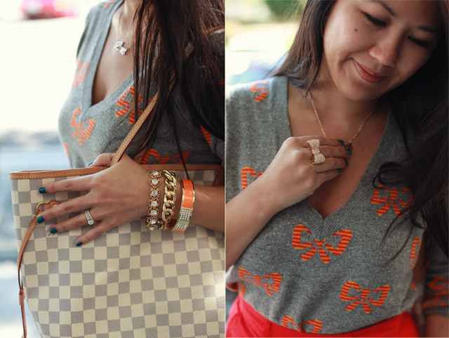 t+j Designs Rose Gold Love Necklace, Pretty Baubles Bracelet, Gold Chain Link Bracelet, Orange Enamel Bangle to come soon. Champagne Pave Bow Ring – I love this ring! It’s so blingy and is the perfect addition to all my outfits 🙂
