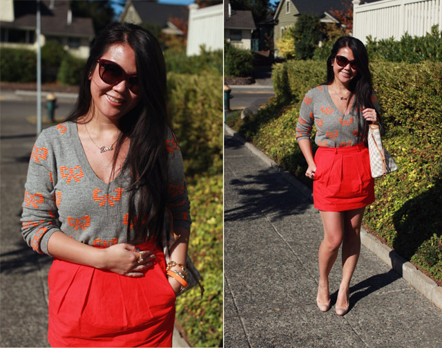 October 23, 2012 at 1:52 amI like how you've paired the sweater with a bright skirt! My first instinct would not be to tuck a sweater into a skirt, but this post is making me rethink what I have in my closet to create a similar outfit 🙂