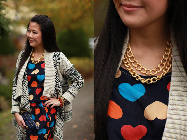 November 12, 2012 at 6:41 pmT – You look darling in this hearted dress with the mixing print sweater! Love the accessories esp those Dior heels (yum!)! You and Jenn have the most amazing wardrobe, wish I can raid your closet (but that would be kind of creepy given you don't know me personally lol). π