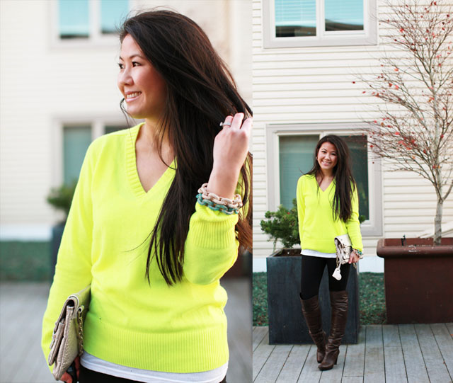 November 28, 2012 at 7:58 amThe neon looks great on you! And this outfit post reminded me that a smile is your best accessory 🙂