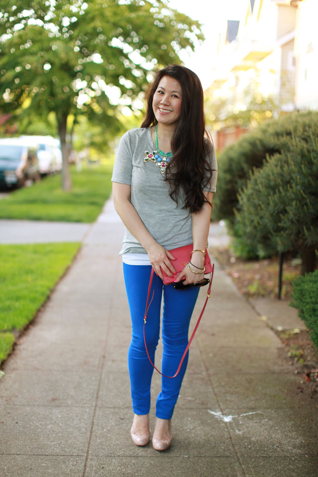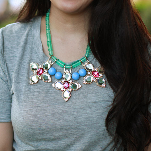 Not the most exciting or creative of outfits but this is what I wear on most of the days that I’m home with my baby girl. She’s crawling up a storm now so I’m always on the floor playing with her or trying to keep her away from everything she wants to touch but is not supposed to! When I walk out the door to go somewhere I always grab a statement necklace to dress up the outfit and that’s one of the best parts of owning your own jewelry line, I have tons of options!