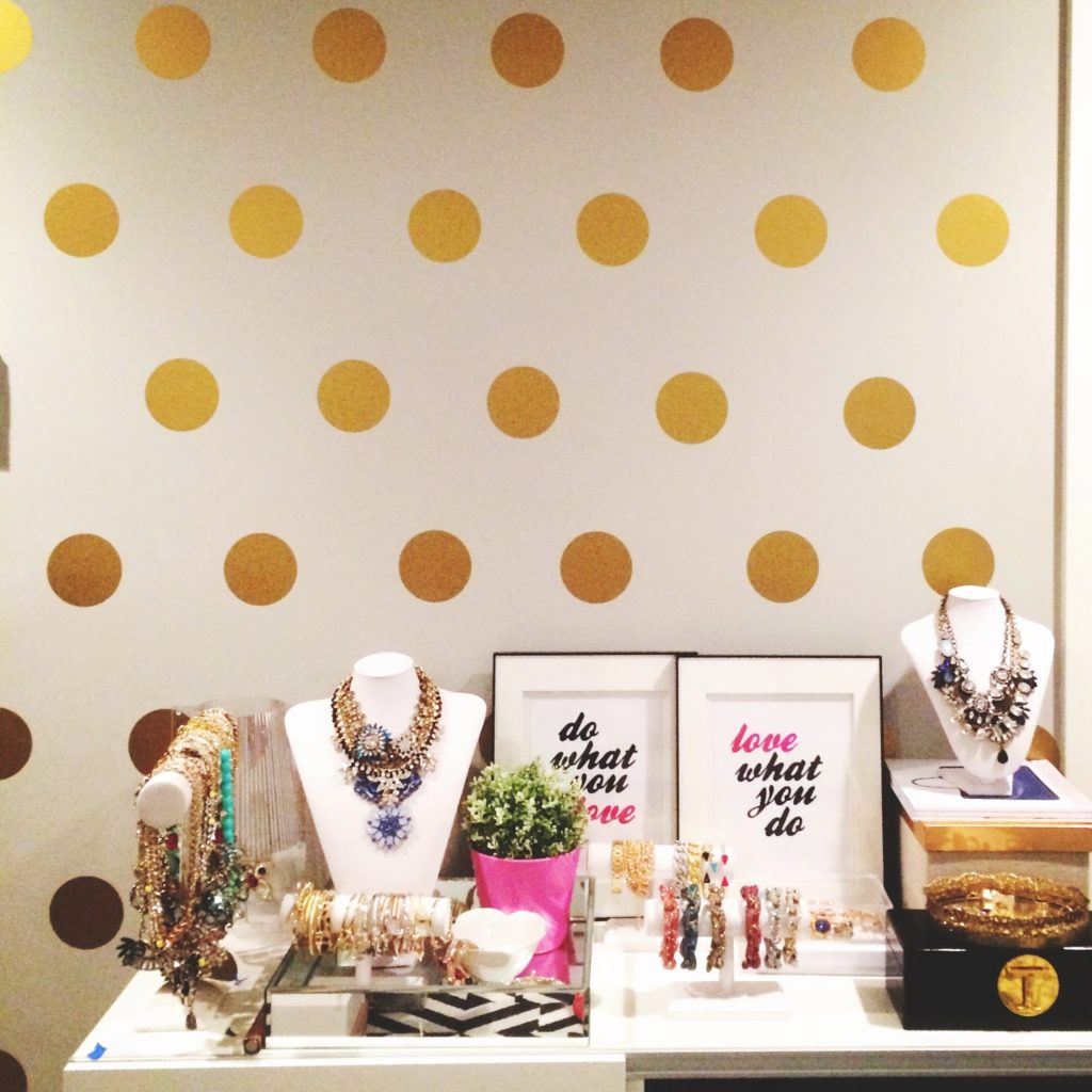 Sorry for the grainy photo here, I literally took this photo at 2am.  I had bought these polka dot vinyl decals about a month ago (mine are the 4″ ones) and knew it was going to take some time to put them up so I kept on putting them off until one night after I put Layla to bed, I was determined to just tackle it all in one night!  The decals themselves are very easy to put on.  It’s the measuring of the wall, the distance between your dots and trying to get them spaced just right is the hard part.  I absolutely love how it turned out though and my office is that much more fun with this wall!