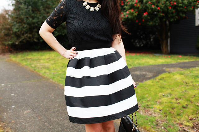 I got this lace top at Ann Taylor (it’s super marked down now!) and have been pairing it with everything. I don’t know why I didn’t have a basic lace top before but glad I do now! I love our new line of skirts and I’m not just saying that because it’s our design! I adore how it poofs out just right and of course the stripes! Just a fun fact: It’s so hard to find the right size stripe on the right kind of fabric that this is custom made for us at our factory. Same with our polka dot fabric! You would think that stripes and dots would be easy to come by but it certainly isn’t!