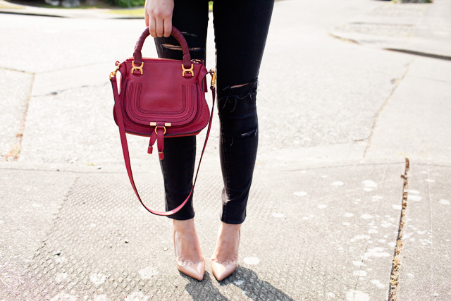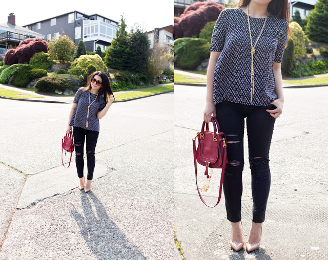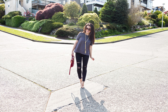 My favorite ripped jeans, a relaxed tee and nude heels is my go to outfit lately. I love this swing tee, it’s super comfortable and is a bit nicer than just a regular tee so I don’t look super casual. And you know I love adding a good statement necklace to most my outfits but I’ve really been feeling this tassel necklace that has been a best seller in my line for awhile now! There’s just so many ways you can wear it but my favorite is to just tie it in a knot like this.