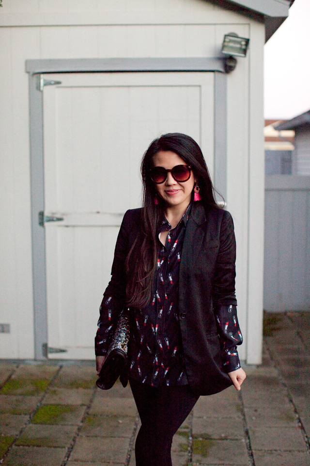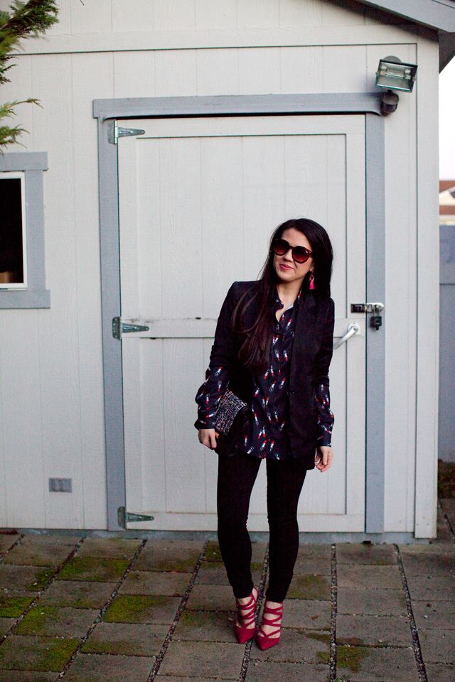 January 12, 2016 at 2:56 pmSuch a cute lipstick print blouse and that fringe earrings are adorable! Chic strappy heels too!