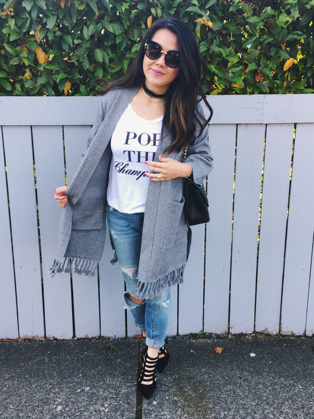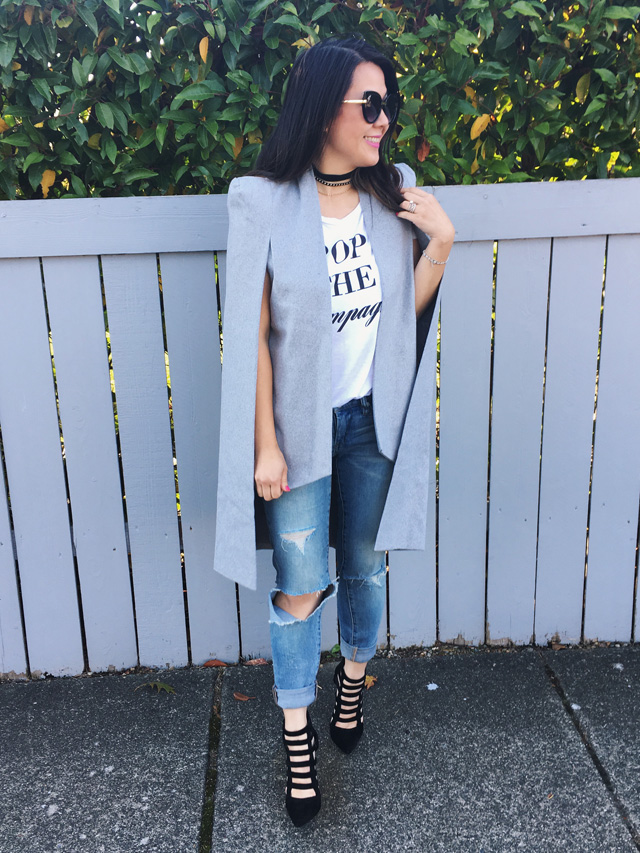 I’m all about creating versatile outfits and lately I have a super easy uniform of a graphic tee, ripped jeans and heels. I wanted to play around with what I could do with this simple outfit and turns out all you need is a cute outerwear to create two different looks.