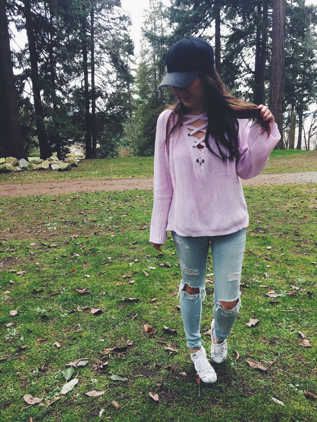 I wore this more casual look when my husband, daughter and I took our doggies for a walk around the park.  I obviously didn’t need to look super cute or anything but it’s really not me to be the type to go out in sweats so a sweater, jeans and baseball cap are as casual as I go.  I just love the color of the sweater and the lace up detail really makes it so fun!