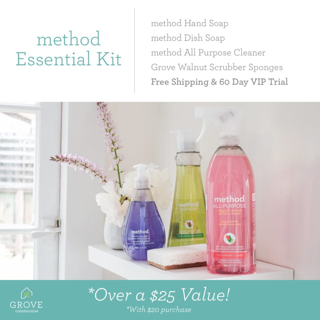 This week only if you sign up for Grove Collaborative and place an order of at least $20 (trust me, you’ll find plenty of things to buy!) you will get the method Essential Kit for FREE! All you have to do is head HERE to sign up for Grove Collaborative and you’ll receive everything pictured above for free when you sign up and spend $20 or more on your first order. You’ll answer a few quick questions about your home that they’ll use to customize your basket. Then you’ll finalize your basket by adding or removing items to get exactly what you want. Before you check out make sure your order totals at least $20 to get the free gifts!
