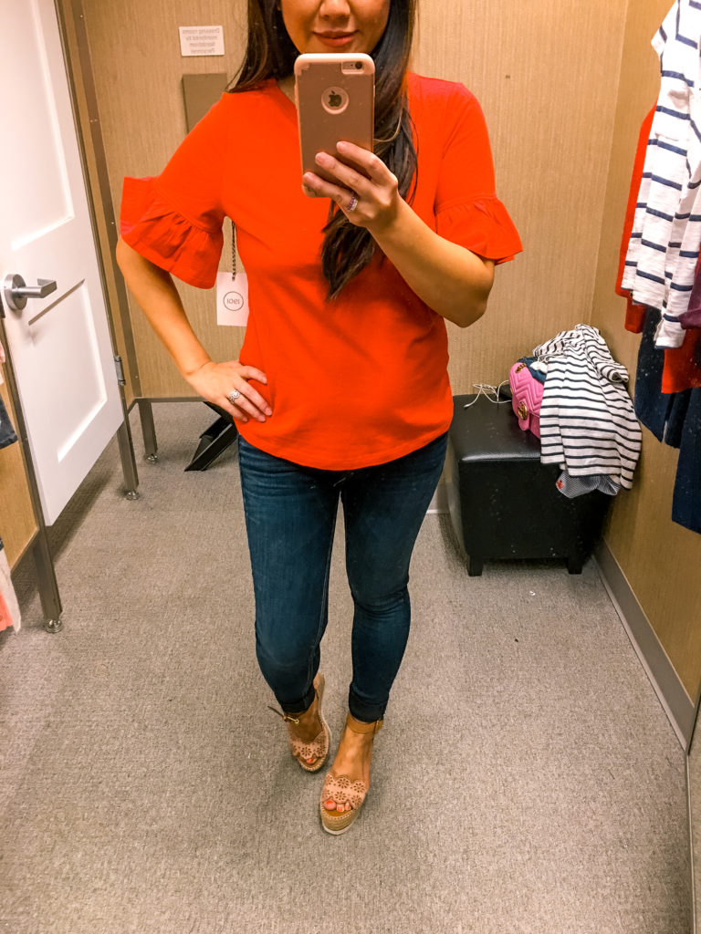 A ruffle sleeve top is always a win in my book! I love having these kind of tops for casual days but you still want a fun element to your outfit. The Rag & Bone skinny jeans are a great dark wash and fits great.