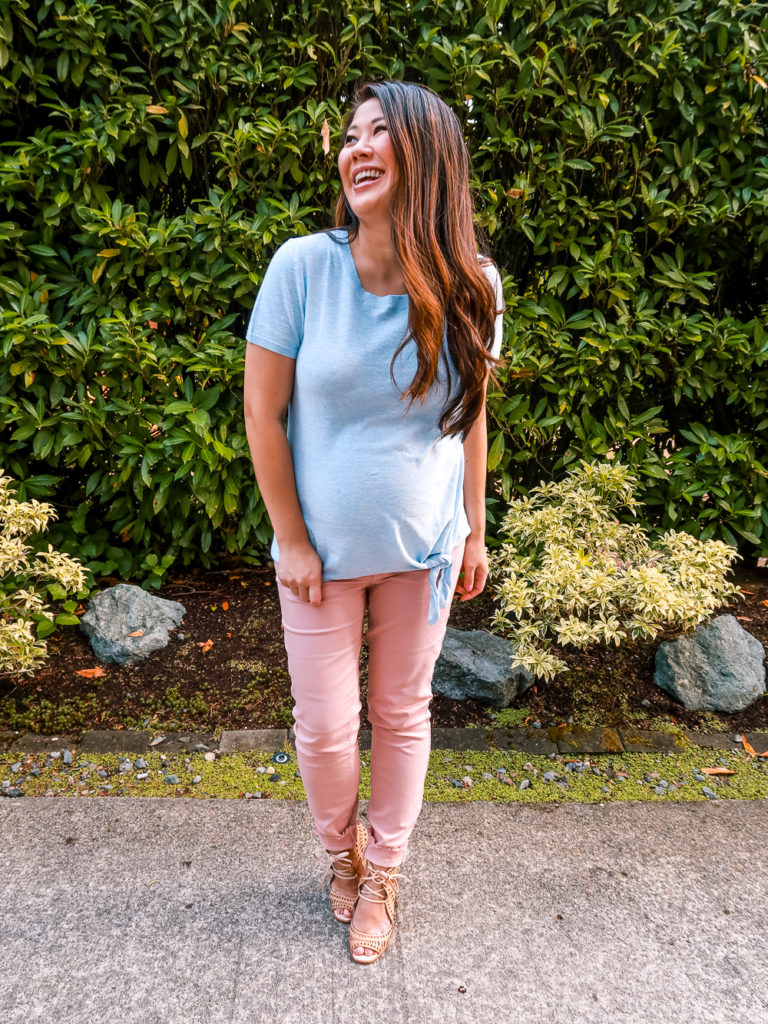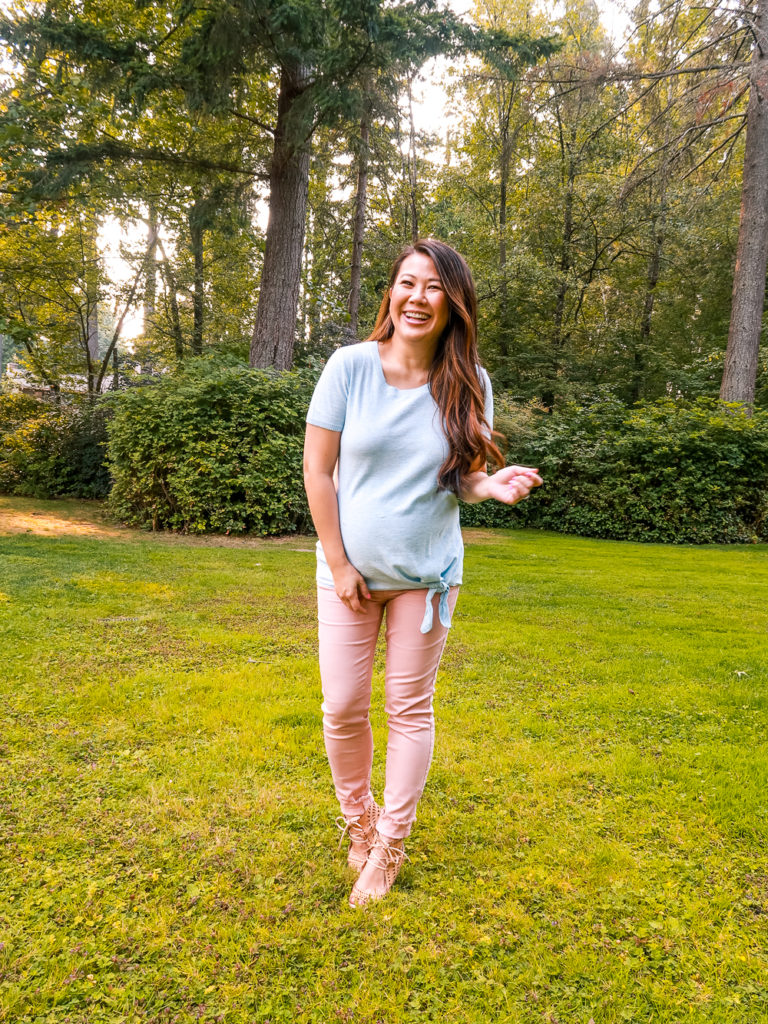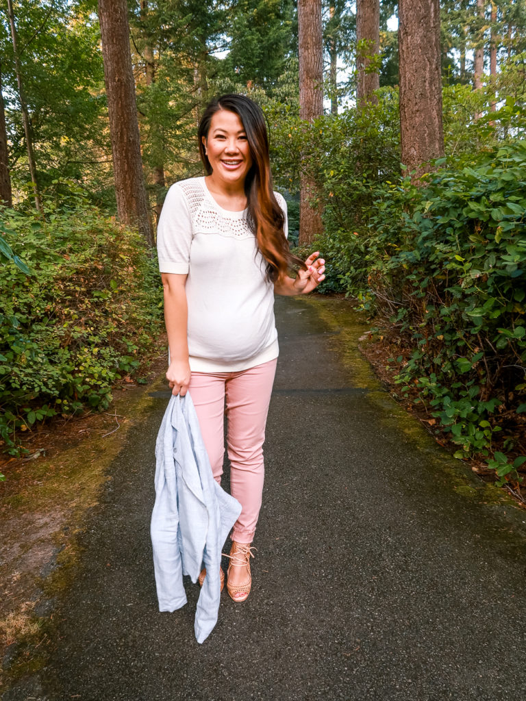The pieces that I bought are not maternity but because of the stretch, they easily fit over my bump. I’m about 30 weeks along here and am very grateful for my belly band so that I can still wear these cute pink jeans that I recently got. I love the color and can’t wait to incorporate them into more outfits for fall.