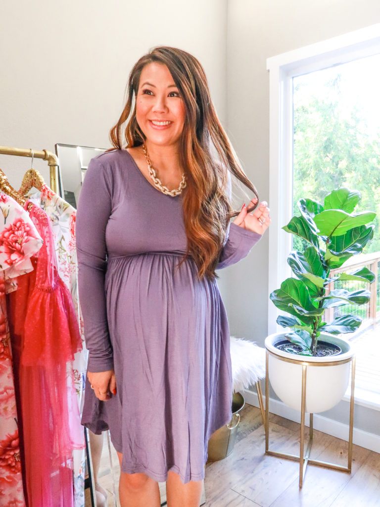 This dress is super simple and comes in 9 colors and in a sleeveless version. Best part? It’s less than $20! Super accommodating for your growing bump. I love that I can even wear my belly support band underneath it as my bump is currently very heavy and any kind of support I get right now helps me out!
