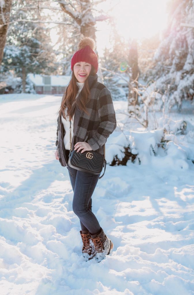 This plaid sherpa jacket is one of my favorite coats that I own! I love the classic print and the fit is really flattering too. You can’t see in this photo but my sweater has the cutest heart elbow details! I know I will be wearing this all season as it’s so soft, and these boots are the best for the snow as they has waterproof soles.