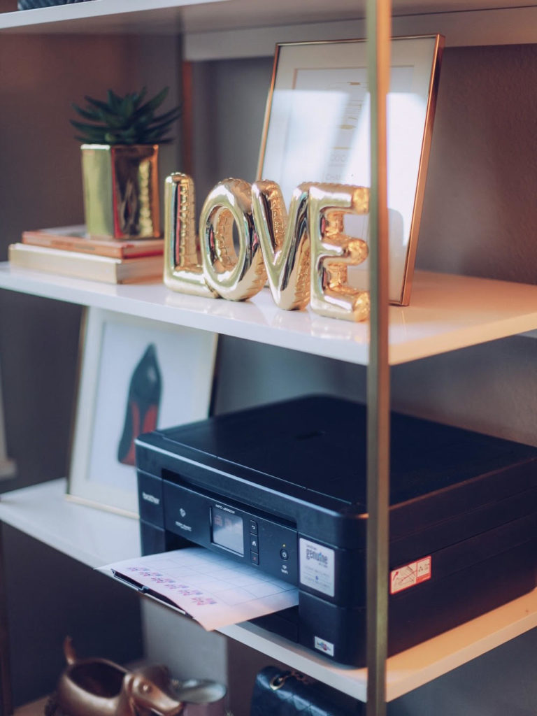I’m a work from home mom which means I work anywhere in my house, and usually with a baby attached to my hip. I set up this Brother printer in our family room which seems like an odd place, but I spend more time here than I do in my home office. I actually love the printer here because of the easy access and that I can print over Wi-Fi which means no extra cords are needed.