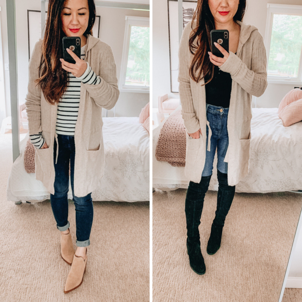 I wanted to share some outfit ideas that use the same pieces with some easy swaps. If you are looking to purchase anything at the Nordstrom Anniversary Sale, I highly recommend a long cardigan, dark skinny jeans, booties and over the knee boots. Honestly, I feel like these are outfits that I’m going to be living in this fall and winter. And even better, all of these are great for #momlife as well.