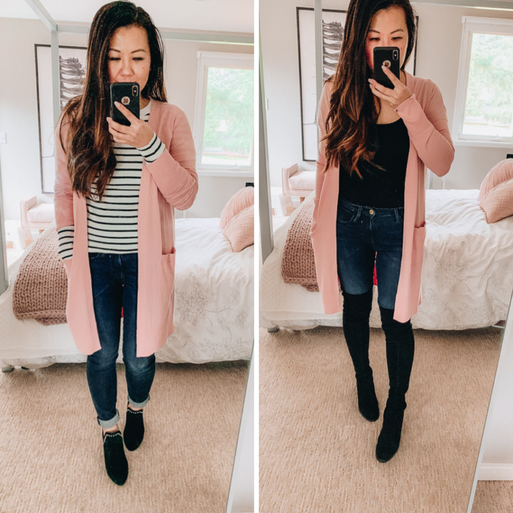 The pink cardigan is lightweight and so easy to wear with every outfit! I’m thinking about getting this one in a different color too.