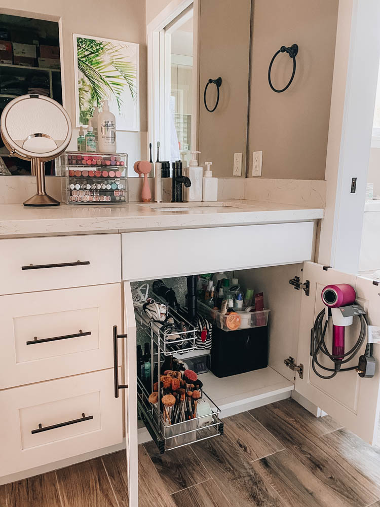 This is my bathroom below. I had to utilize the under sink area as functional as possible as I use so many products almost daily! The sliding organizer is a must have! So much easier to access your items without having to bend down and dig around. And the blow dryer holder keeps the cords nice and neat and easy to reach when I need it.