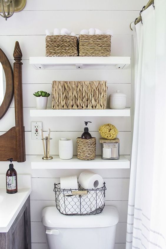 If you’re dealing with a smaller space, getting creative in how you utilize the space you do have makes all the difference. The space above the toilet can be used to store lots of different things. I love the way open shelving looks above here and they also have a lot of cabinet options made to fit above the toilet as well.