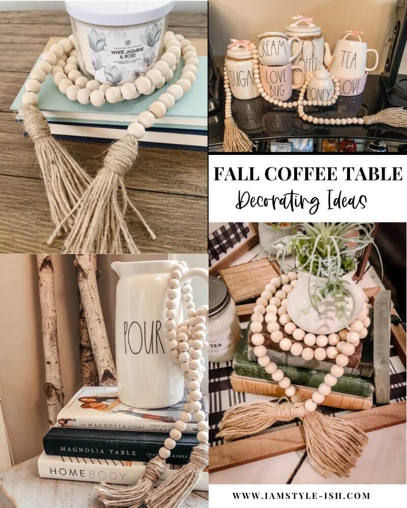 One of my favorite ways to add some fall to your home is to decorate your coffee table. Wooden bead garlands are so simple and add just the right touch when added to books, plants or jars.