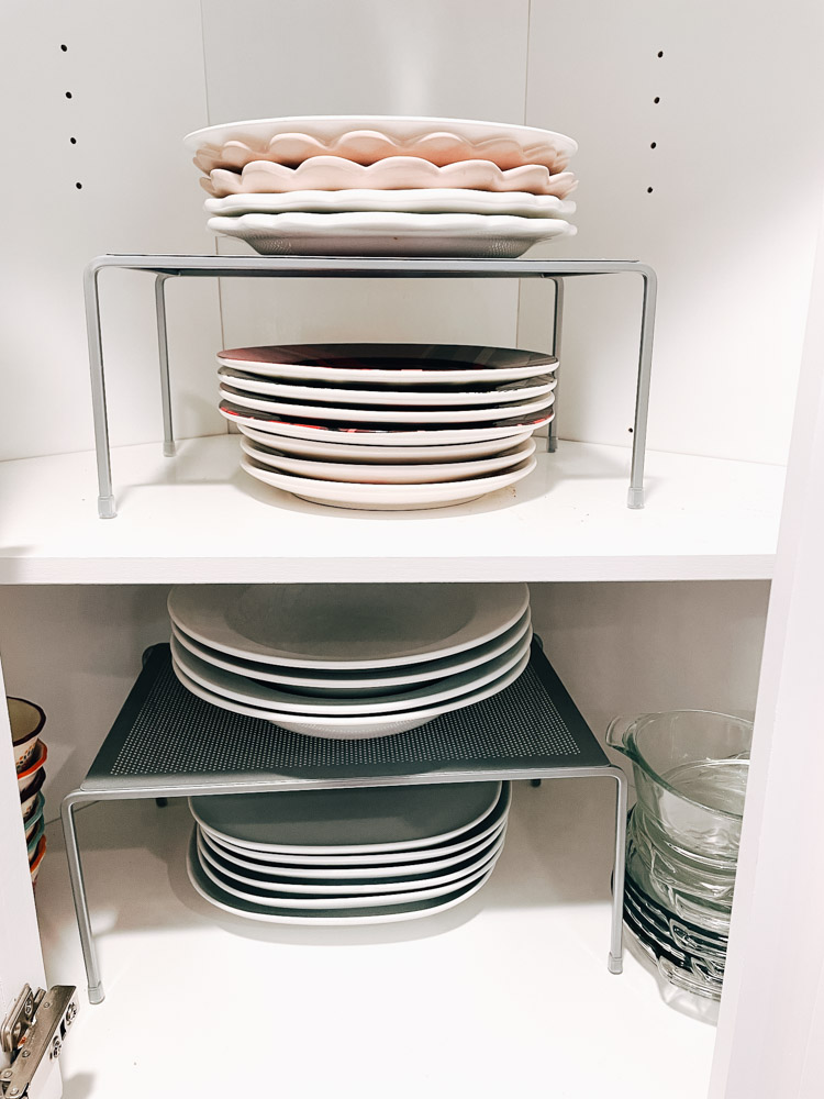 Take advantage of all the space you have in your cabinets, especially if you have tall cabinets like we do! I love these little shelves so you can stack everything from plates to cups and anything you need organized. We use them for our kids cups and bowls too!