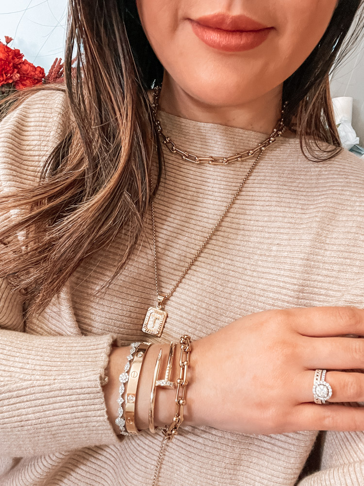 Personalized jewelry is always a great gift. This initial pendant necklace can be customized with any letter and also comes in different chain sizes. The paperclip choker necklace is a great piece that’s very on trend and also super affordable! All the jewelry linked here is under $20! Some are dupes of the more expensive pieces that I’m wearing but are great quality for the price!