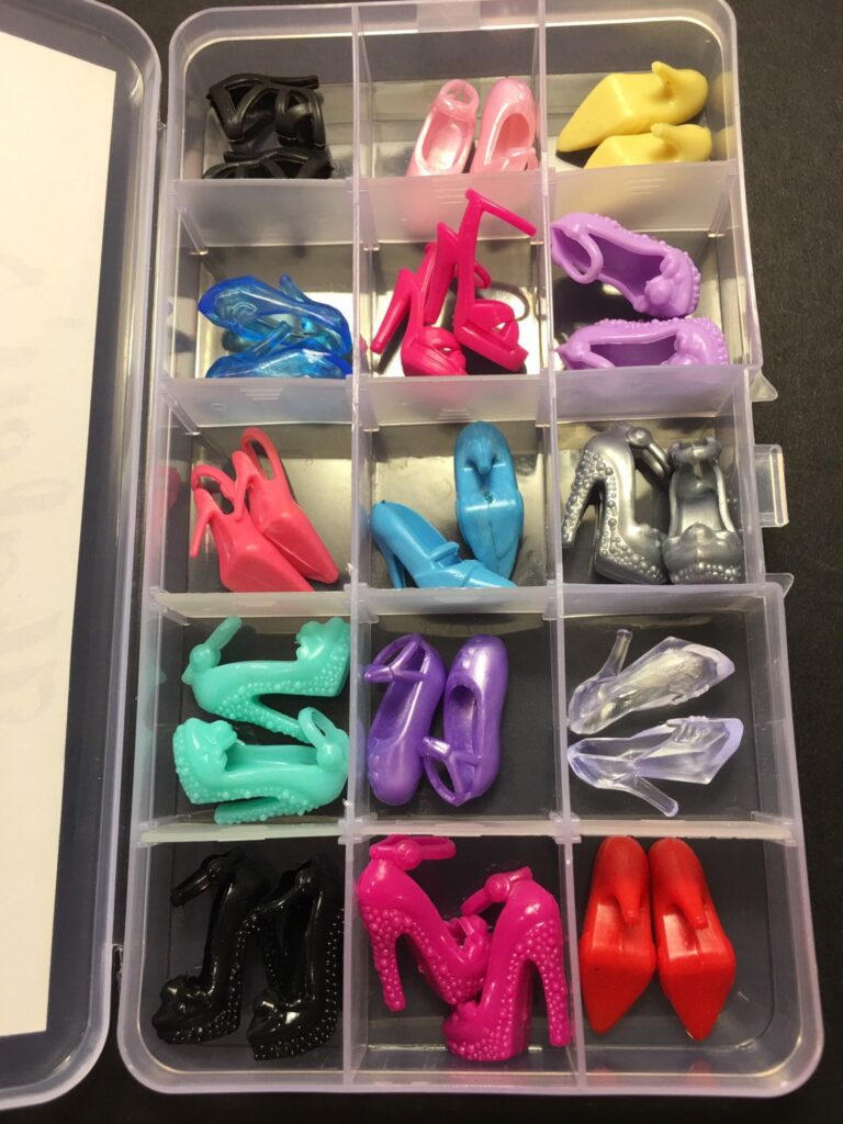 No more stepping on / finding loose barbie shoes around the room! These plastic craft organizers that hold craft supplies/beads are the perfect solution for little barbie shoes and accessories to be kept in neatly.