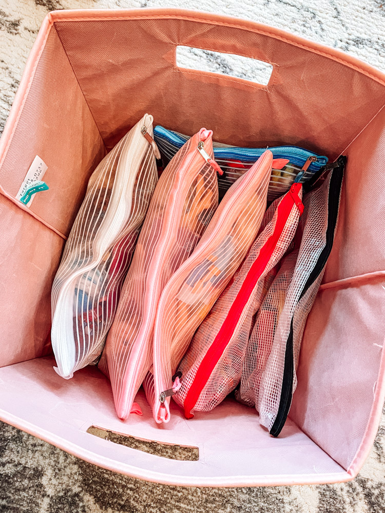 My daughters rotate their toys because they admittedly have way too many. So with their dolls, I store some in these zipper pouches and then we switch them out. These pouches are inexpensive but great quality. They are reusable and can store anything (I even use them for my home office and also for my makeup!)