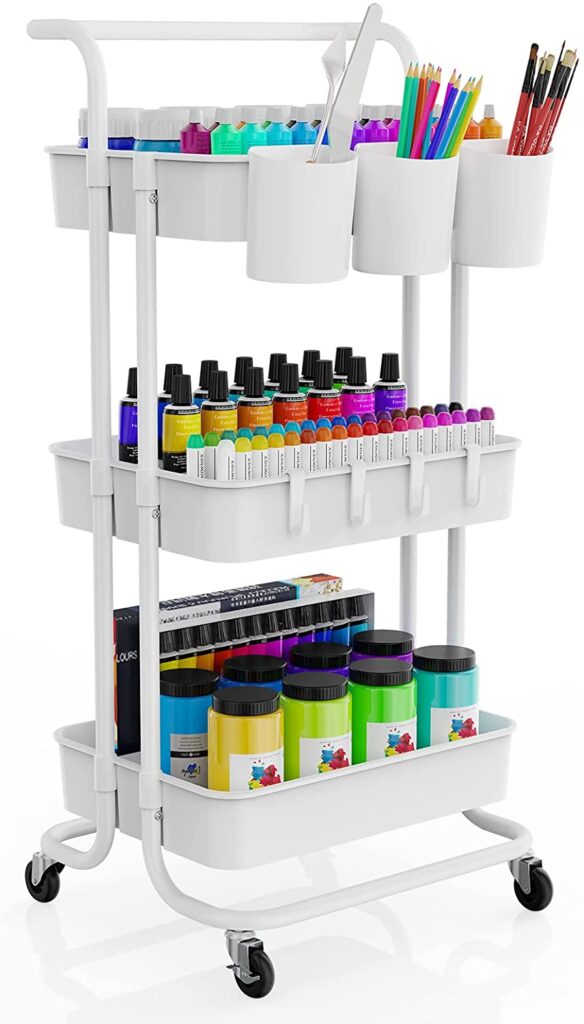 Looking for a mobile organization solution? These craft rolling carts have endless possibilites. They come in different sizes and heights depending on your needs and you can totally customize them as to what bins and smaller organizers you add on each shelf. I think these are great as my girls sometimes play in their rooms and sometimes in the playroom, so we could easily move this around the house as needed.