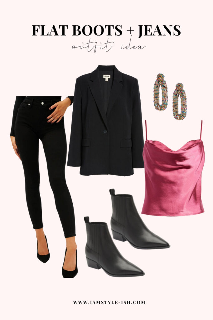 Flat boots and jeans does not just have to be for casual settings! A great black pair of skinny jeans and faux leather pointed toe black boots is so flattering and looks so dressed up.