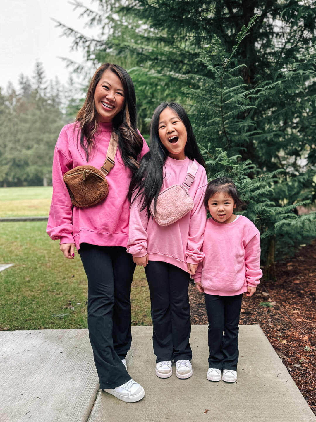 I am so happy that these fuzzy belt bags are trending, as I find myself constantly reaching for it! It is so convenient when I am taking my daughters to quickly run errands, go for a walk or go to the park.