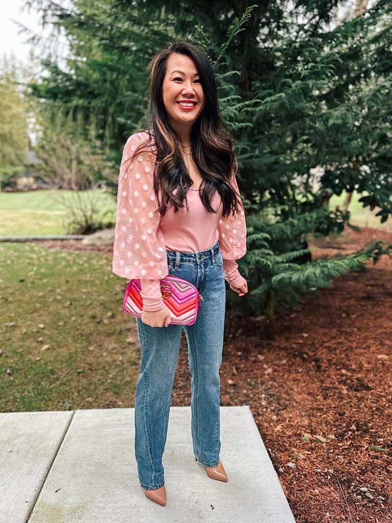 The sheer puffy polka dot long sleeves of this shirt are so fun, paired with denim jeans for a casual look.