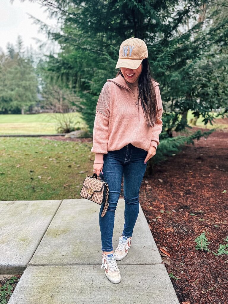For a more laid back, casual brunch outfit pair a pullover half zip with jeans!