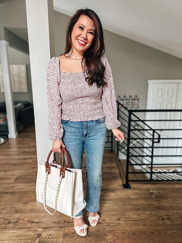 I love to wear lighter denim washes as well as white jeans in the Spring, and you can always roll up the jeans a bit to show off the sneakers!