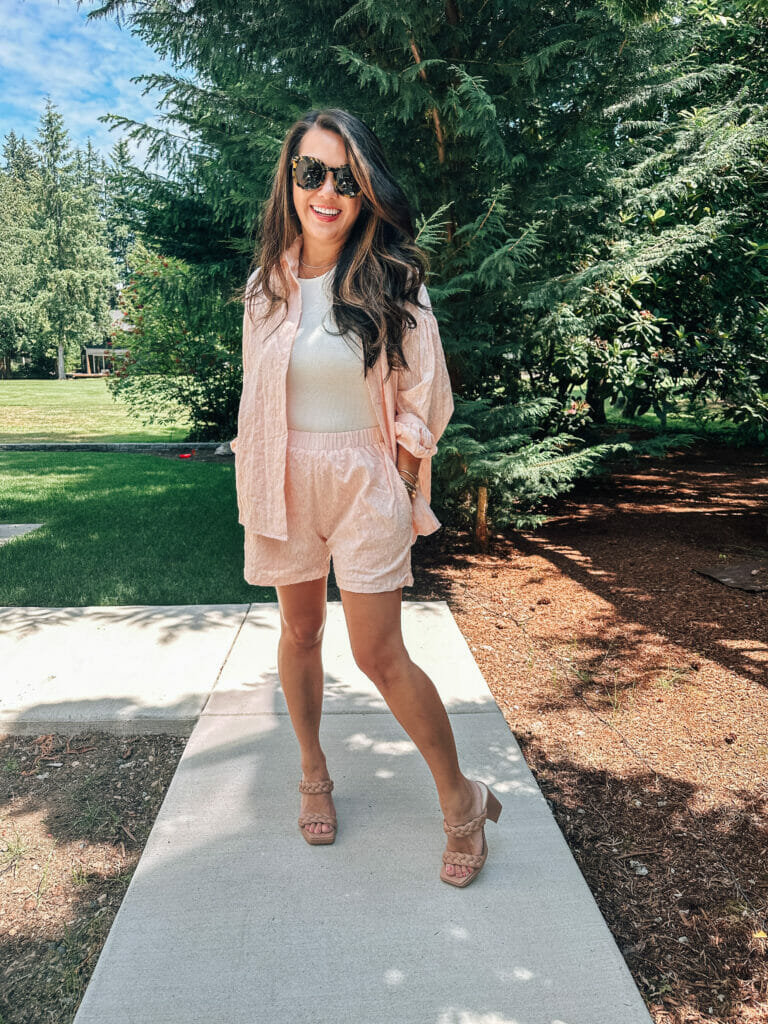 A short-sleeve button down in a neutral color, paired with skinny jeans and your favorite sandals.