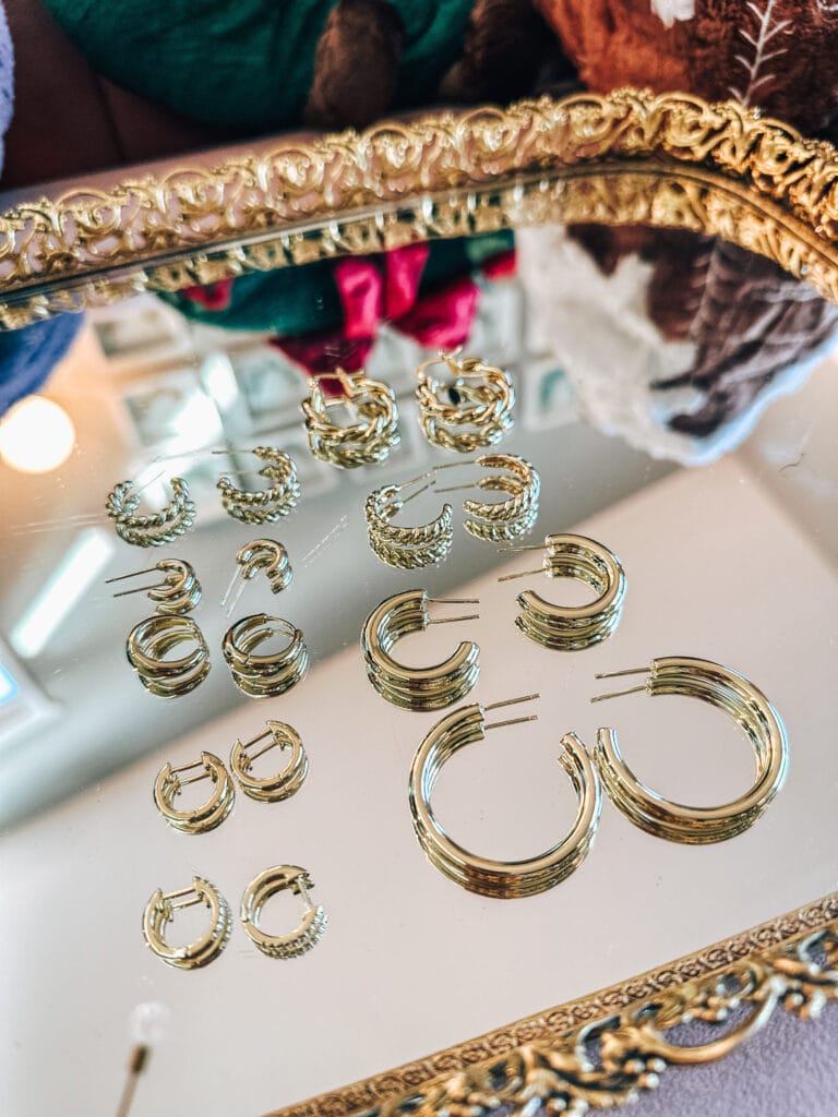 This hoops earrings set is the only set you need if you love hoops! It has all different sizes with different textures and comes in gold, rose gold and white gold. You get all 9 pairs for an amazing price!