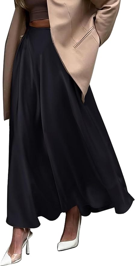 Overall, the satin midi skirt and sweater combination is effortlessly chic, offering a polished yet relaxed look that is ideal for springtime outings or casual errands.