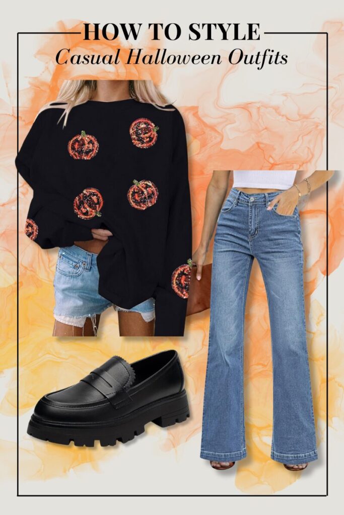 Casual Halloween outfits are all about comfort with a dash of festive fun. Whether you’re running errands, relaxing at home, or enjoying a laid-back day with friends, these outfits combine cozy sweatshirts with easy-going bottoms like jeans or joggers.