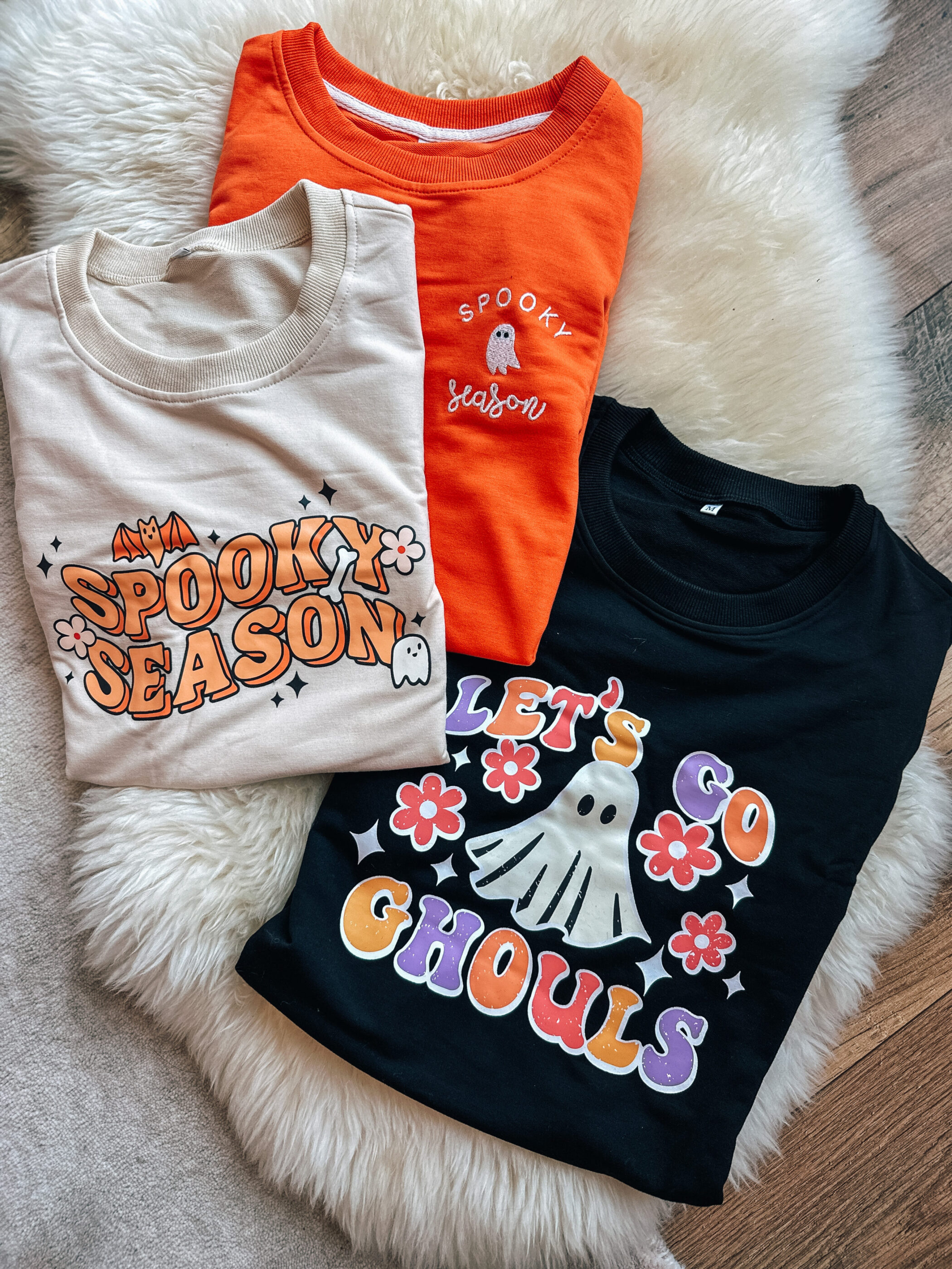 - Sweatshirt: Cream-colored sweatshirt with subtle Halloween details.