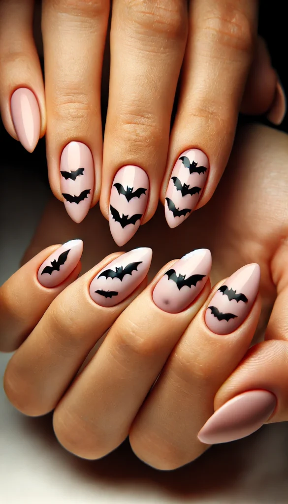 Let black bats peek out from the corners of your nails on a nude pink base. This design adds a touch of playful surprise to your manicure, perfect for a subtle Halloween vibe.