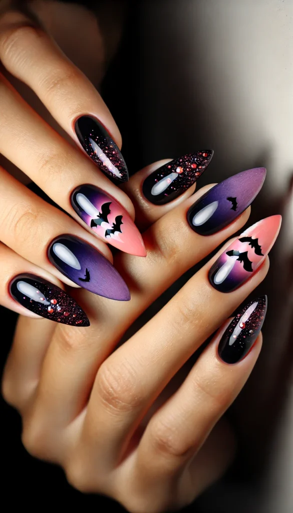 A dark purple to pink base with a black starry sky and bats makes for an enchanting Halloween manicure. This design is both mystical and charming, perfect for a night under the stars.
