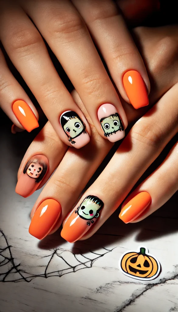 Frankenstein’s monster gets a cute makeover with light pink nails. These nails are fun and festive, perfect for anyone looking to add a quirky touch to their Halloween look.