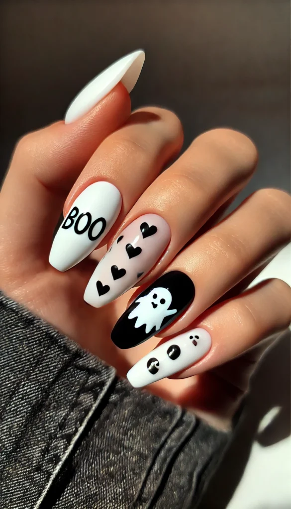 Black and white nails, topped with cute ghost faces, create a playful yet elegant Halloween look. This design is great for those who love nails with a playful twist.