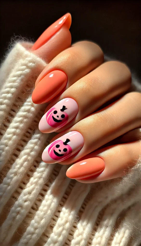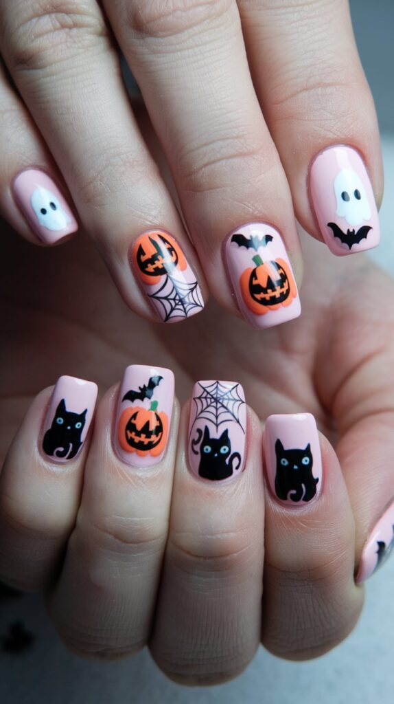Give your pink nails a Halloween twist with pink mini pumpkins and ghosts. It’s a fresh take on the classic pink manicure, perfect for the fall season.