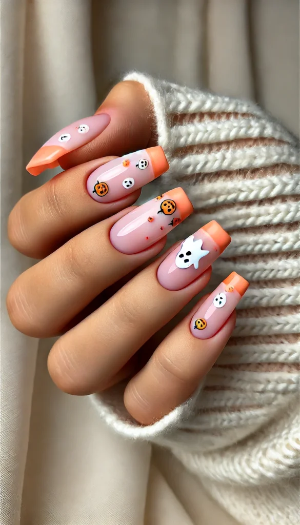 - Design: Black or orange French tips with tiny Halloween motifs like pumpkins or ghosts at the tips.