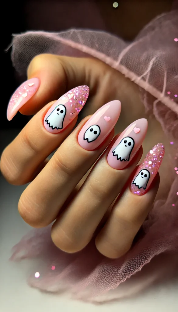 Add some sparkle to your Halloween nails with ghostly figures on a pale pink base, topped with pink glitter. This design is both cute and glamorous, perfect for a fun night out.