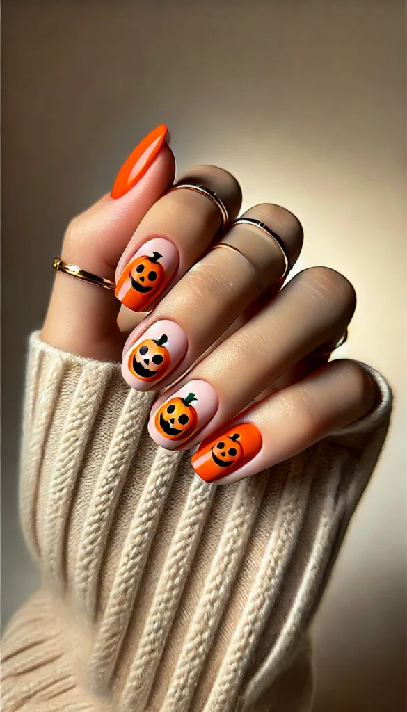 - Design: Different pumpkin faces on each nail, some smiling, some winking.